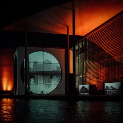 This photo shows a video projection onto the Marie Elisabeth Lüders Haus in the government district of Berlin.