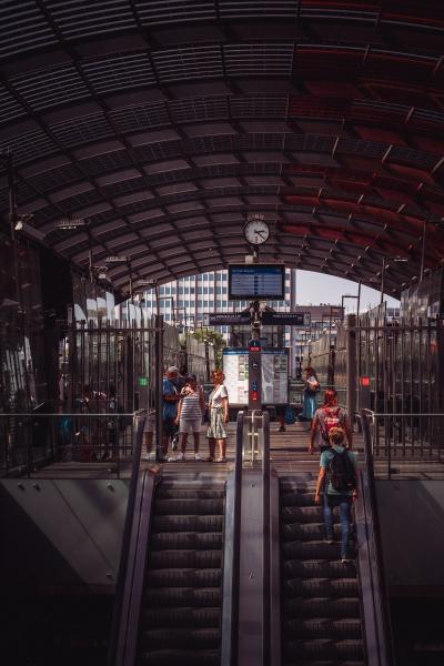The summer sun was shining through the glass roof of Amsterdam Central Station, creating a beautiful light. Some glass panels are colored orange and form the word AMSTERDAM. In the right light, this place is a paradise for street photographers.
